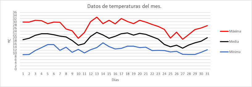| MEDIA DE LAS MAXIMAS: | 22,9 | ºC | Nº DIAS DE HELADA: | 0 | PRECIPITACION TOTAL: | 63,8 | mm. | ||||||||||||||||||||