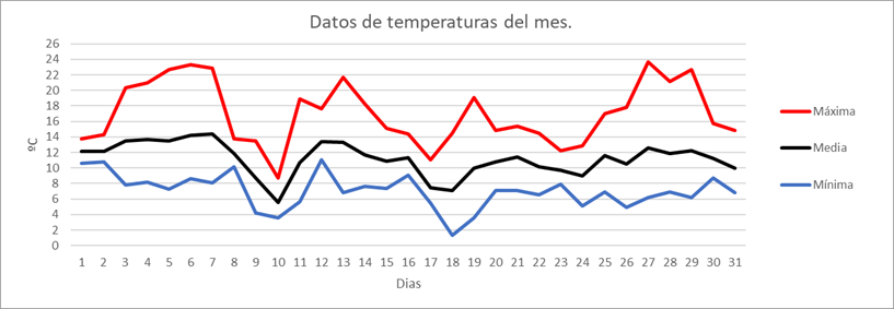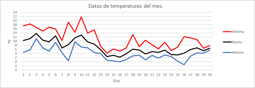 | MEDIA DE LAS MAXIMAS: | 11,4 | ºC | Nº DIAS DE HELADA: | 2 | PRECIPITACION TOTAL: | 182,2 | mm. | ||||||||||||||||||||