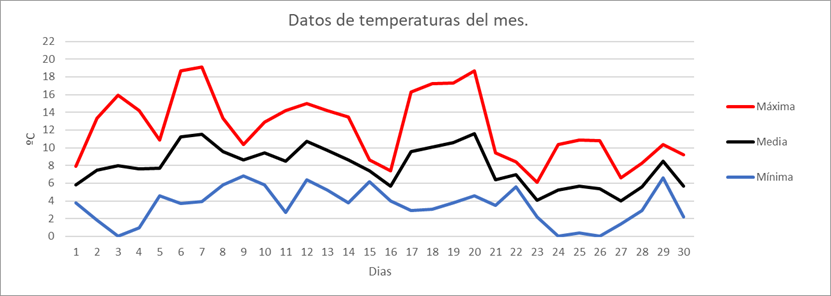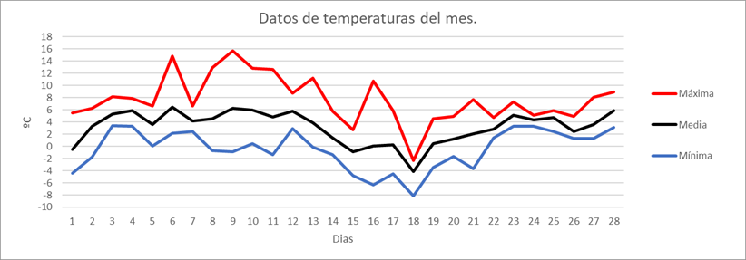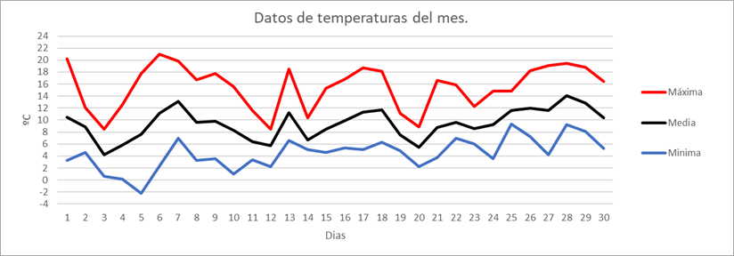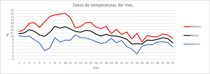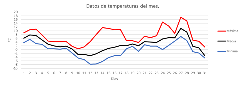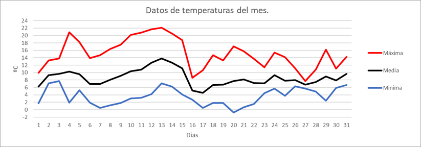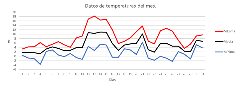 | MEDIA DE LAS MAXIMAS: | 12,3 | ºC | Nº DIAS DE HELADA: | 3 | PRECIPITACION TOTAL: | 147,8 | mm. | ||||||||||||||||||||