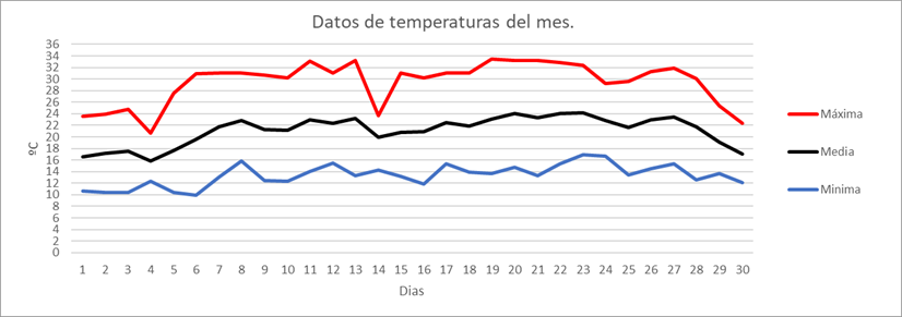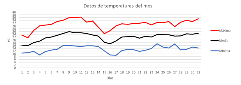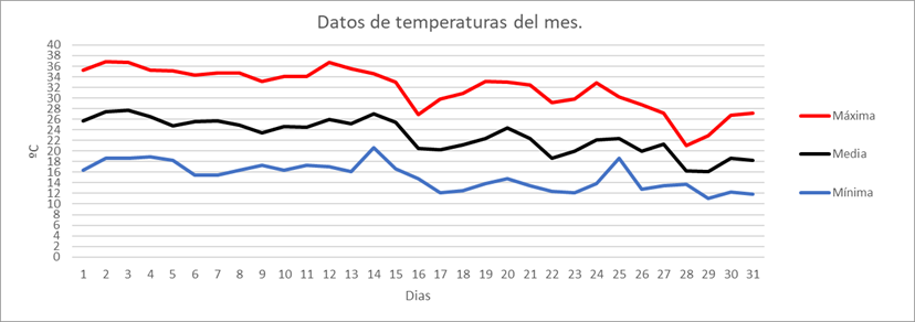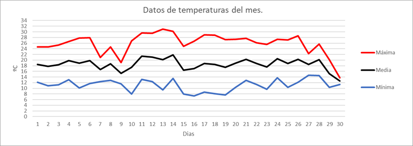 | Nº días máx>=25º | 0 | 0 | 0 | 0 | 14 | 24 | 28 | 29 | 21 | 0 | 0 | 0 | 116 | Nº días máx>=25º | |||||||||||||