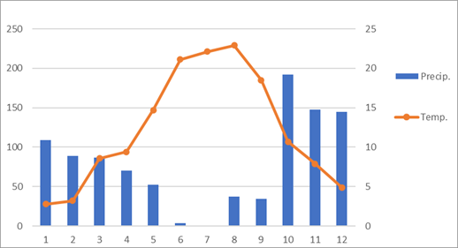 | Temperatura media | 2,8 | 3,2 | 8,6 | 9,4 | 14,7 | 21,1 | 22,1 | 22,9 | 18,5 | 10,7 | 7,9 | 4,9 | 12,2 | Temperatura media | |||||||||||||