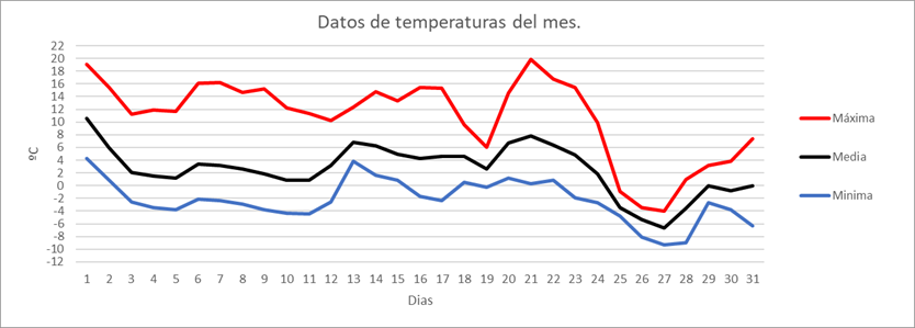| MEDIA DE LAS MAXIMAS: | 10,8 | ºC | Nº DIAS DE HELADA: | 22 | PRECIPITACION TOTAL: | 2,7 | mm. | ||||||||||||||||||||