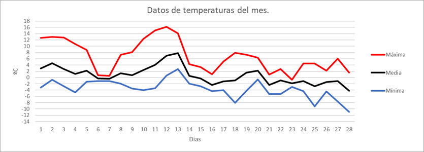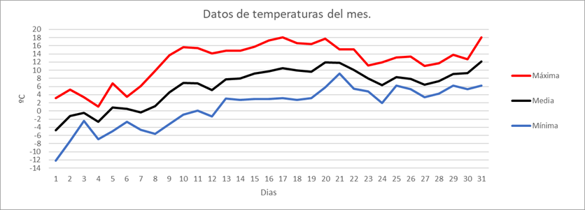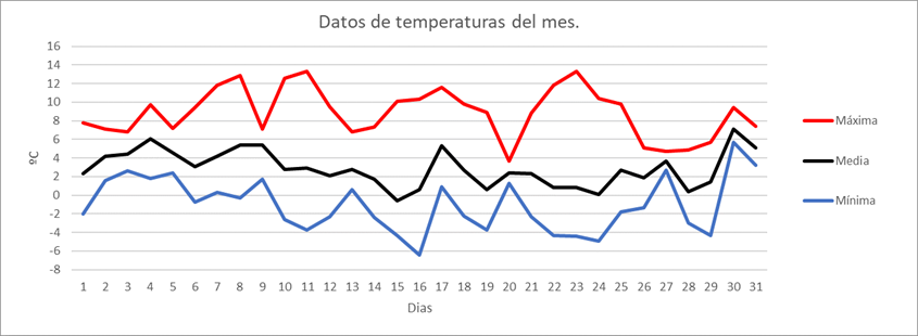| MEDIA DE LAS MAXIMAS: | 8,9 | ºC | Nº DIAS DE HELADA: | 19 | PRECIPITACION TOTAL: | 111 | mm. | ||||||||||||||||||||