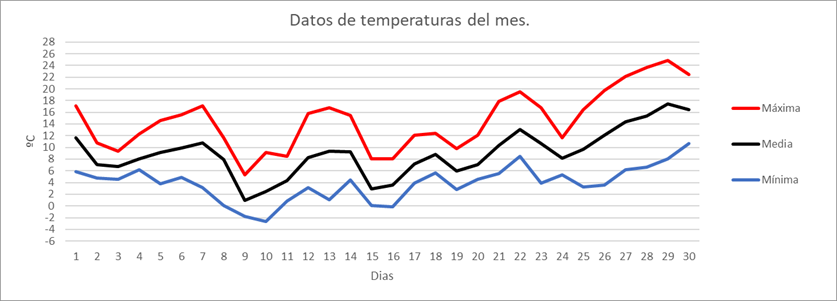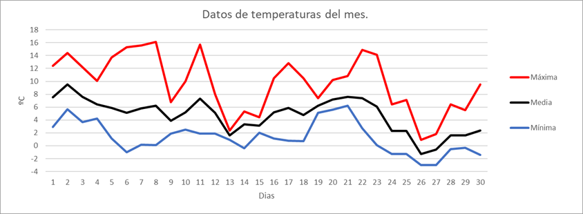 | MEDIA DE LAS MAXIMAS: | 9,7 | ºC | Nº DIAS DE HELADA: | 9 | PRECIPITACION TOTAL: | 70,9 | mm. | ||||||||||||||||||||
