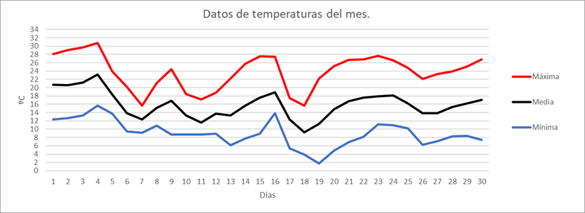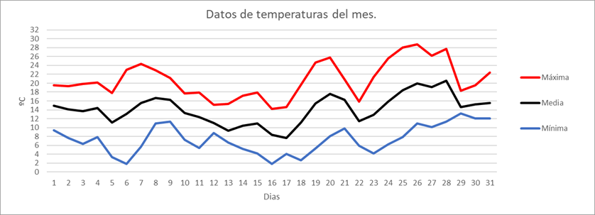 | MAXIMA ABS | 16,1 | ºC | Nº NOCHES TROPICALES: | 0 | Nº DIAS PREC.>=2 MM | 9 | |||||||||||||||||||||