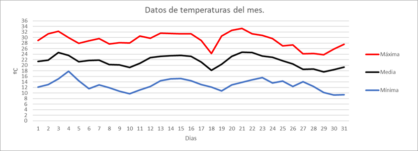 | Nº días máx>=30º | 0 | 0 | 0 | 0 | 0 | 6 | 13 | 11 | 1 | 0 | 0 | 0 | 31 | Nº días máx>=30º | |||||||||||||