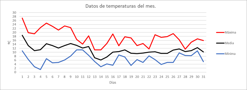 | Media de las máximas: | 10,8 | 6,8 | 12,1 | 14,6 | 20,7 | 27,2 | 29,1 | 28,5 | 23,8 | 17,6 | 9,7 | 8,9 | 17,5 | Media de las máximas: | |||||||||||||