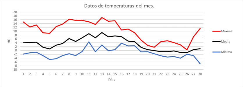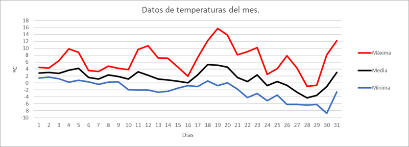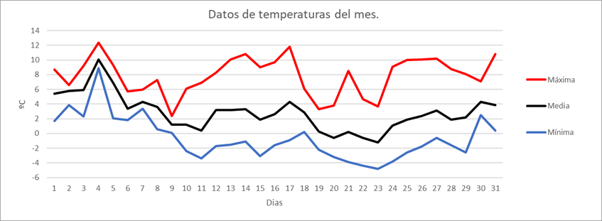 | MEDIA DE LAS MAXIMAS: | 7,9 | ºC | Nº DIAS DE HELADA: | 19 | PRECIPITACION TOTAL: | 76,1 | mm. | ||||||||||||||||||||