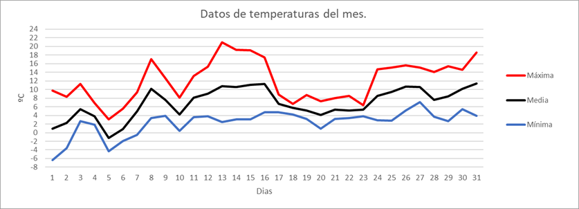 | MEDIA DE LAS MAXIMAS: | 10,2 | ºC | Nº DIAS DE HELADA: | 22 | PRECIPITACION TOTAL: | 63,1 | mm. | ||||||||||||||||||||