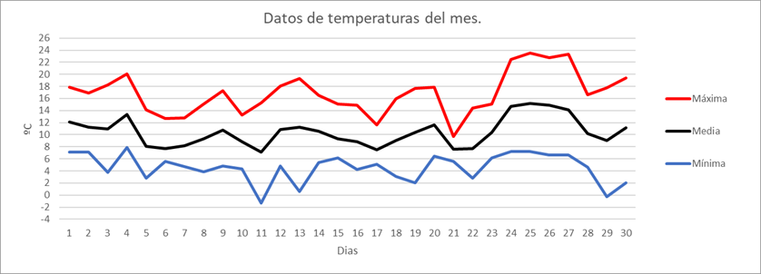 | MAXIMA ABS | 17,1 | ºC | Nº NOCHES TROPICALES: | 0 | Nº DIAS PREC.>=2 MM | 8 | |||||||||||||||||||||