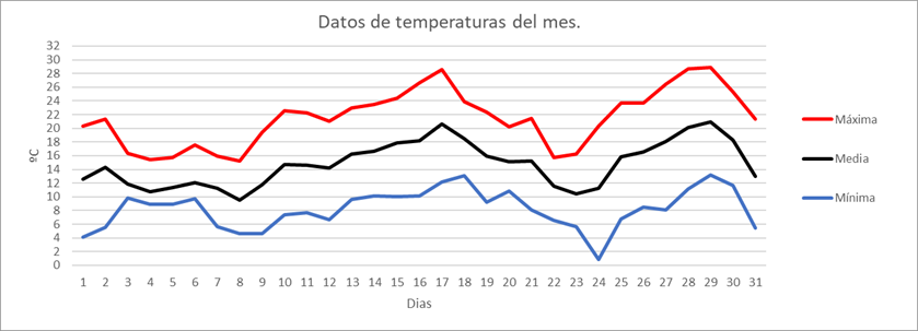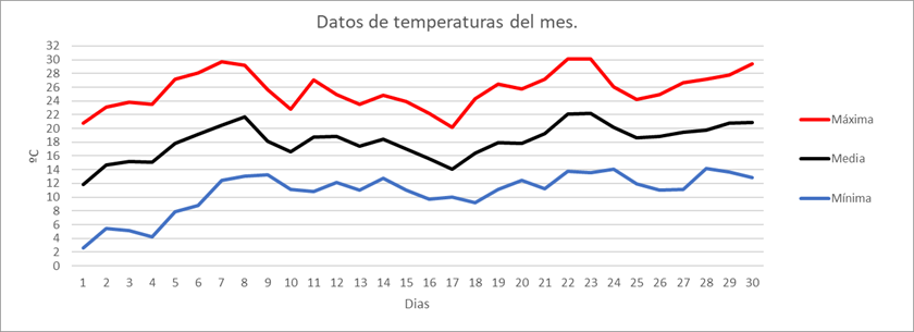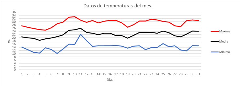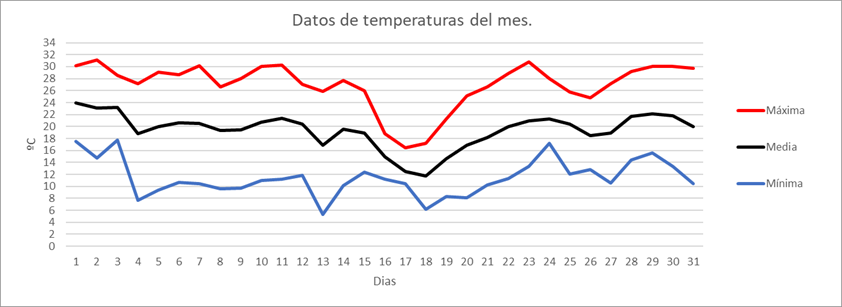 | Nº días máx>=30º | 0 | 0 | 0 | 0 | 0 | 2 | 15 | 8 | 8 | 0 | 0 | 0 | 33 | Nº días máx>=30º | |||||||||||||