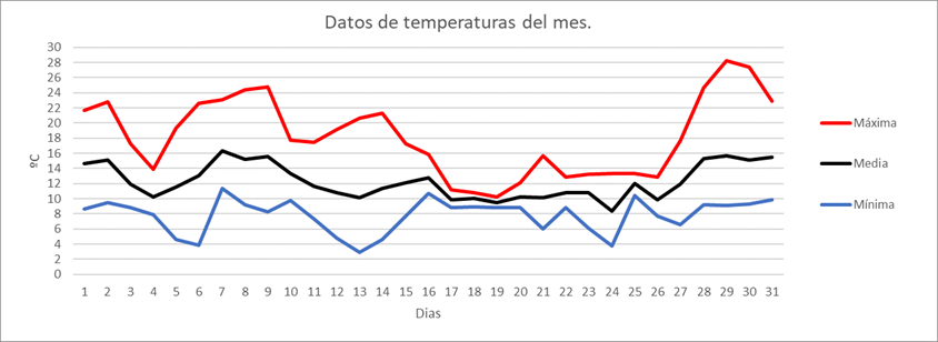 | MAXIMA DE LAS MINIMAS: | 8,9 | ºC | Nº DIAS MINIMA <=-5º | 0 | Nº DIAS PREC.>= 30MM | 0 | |||||||||||||||||||||