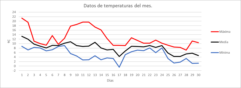 | MAXIMA ABS | 21,4 | ºC | Nº NOCHES TROPICALES: | 0 | Nº DIAS PREC.>=2 MM | 13 | |||||||||||||||||||||