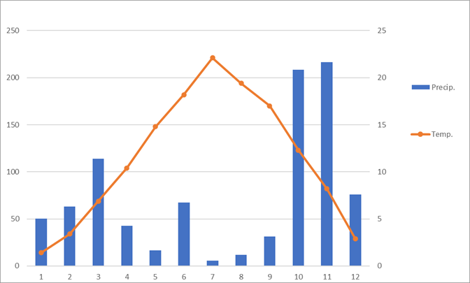 | Temperatura media | 1,4 | 3,4 | 6,9 | 10,4 | 14,8 | 18,2 | 22,1 | 19,4 | 17 | 12,3 | 8,2 | 2,9 | 11,4 | Temperatura media | |||||||||||||