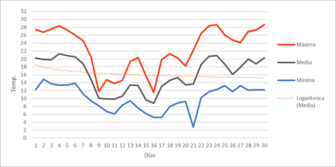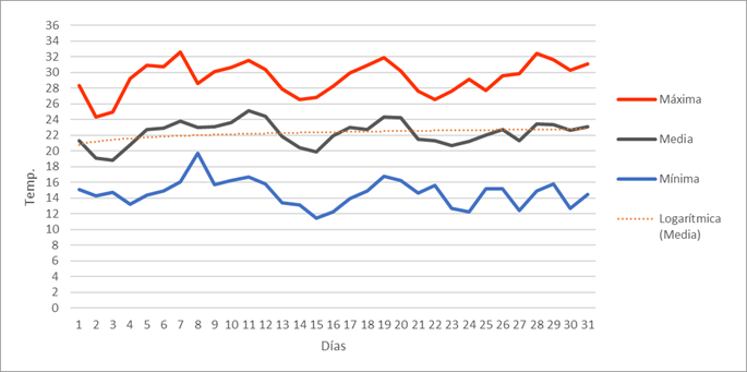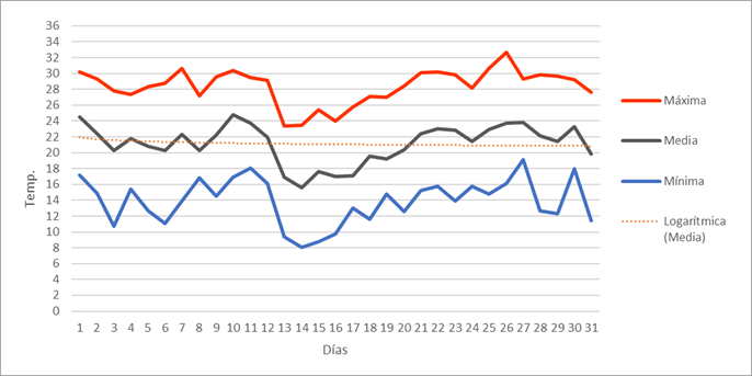 | Máxima mensual | 10,2 | 12,6 | 15,9 | 24,6 | 27 | 28,7 | 32,6 | 32,7 | 28,8 | 22,3 | 20,6 | 18,9 | 32,7 | Máxima mensual | |||||||||||