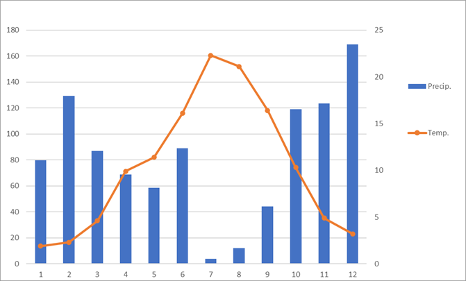 | Temperatura media | 1,9 | 2,3 | 4,6 | 9,9 | 11,4 | 16,1 | 22,3 | 21,1 | 16,4 | 10,3 | 4,9 | 3,2 | 10,4 | Temperatura media | |||||||||||