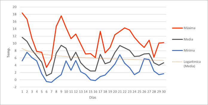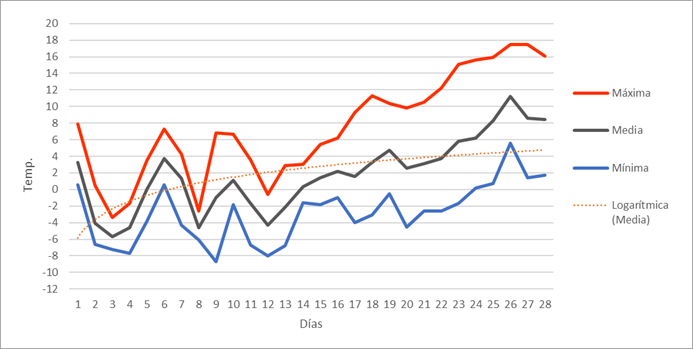 | Nº días de helada | 20 | 21 | 8 | 4 | 0 | 0 | 0 | 0 | 0 | 2 | 8 | 16 | 79 | Nº días de helada | |||||||||||