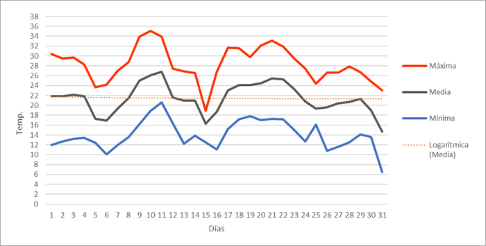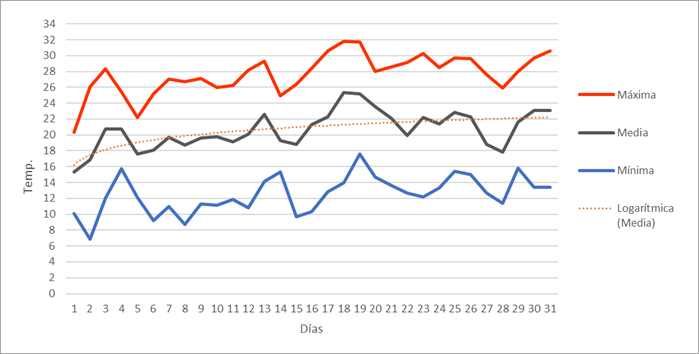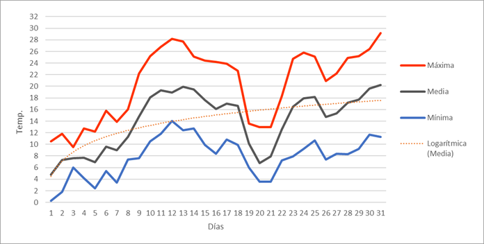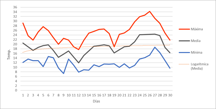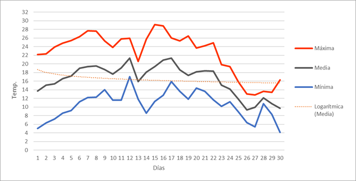 | Media de las máximas: | 10,4 | 7,5 | 14,4 | 10,8 | 20,5 | 25,2 | 27,7 | 28,3 | 22,7 | 16,3 | 9,7 | 8,8 | 16,9 | Media de las máximas: | |||||||||||