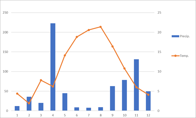 | Temperatura media | 4,4 | 1,9 | 7,8 | 6,2 | 14,1 | 18,8 | 20,6 | 21,4 | 16,4 | 10,8 | 6 | 4,1 | 11 | Temperatura media | |||||||||||