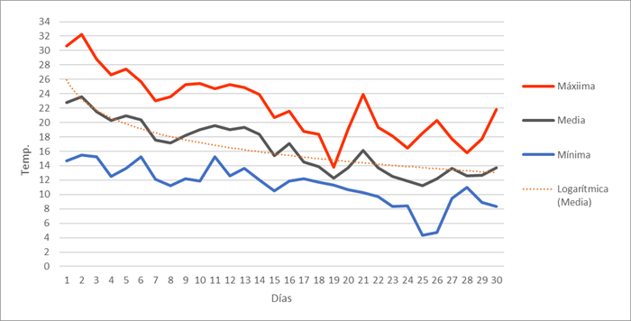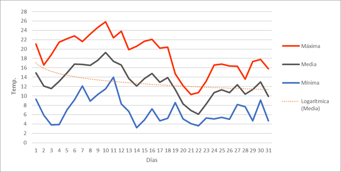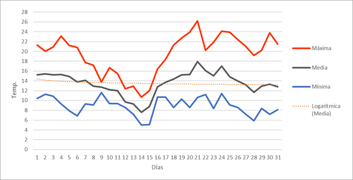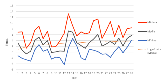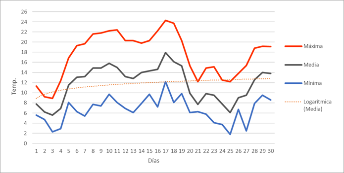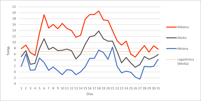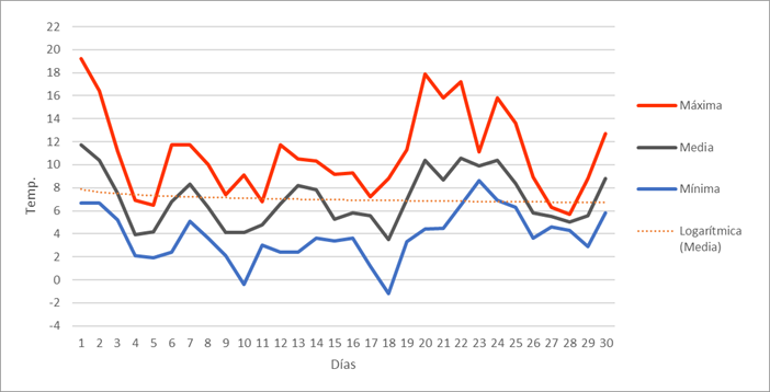 | Nº días de helada | 8 | 14 | 7 | 0 | 0 | 0 | 0 | 0 | 0 | 0 | 2 | 16 | 47 | Nº días de helada | |||||||||||