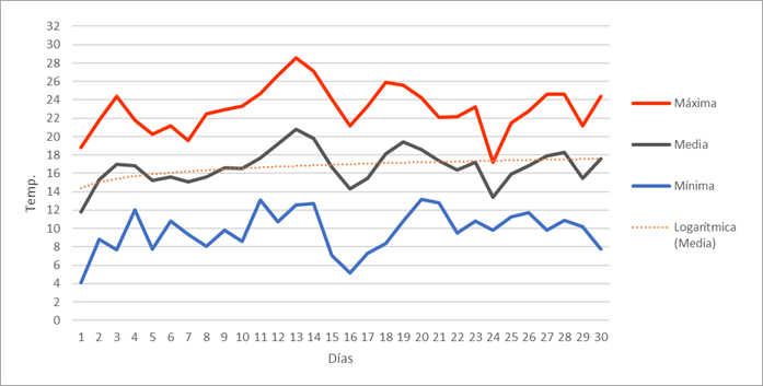 | Media de las máximas: | 7,5 | 6,8 | 12,3 | 17,5 | 18,7 | 23,1 | 25,9 | 26,8 | 22,3 | 19,5 | 11 | 9,7 | 16,8 | Media de las máximas: | |||||||||||