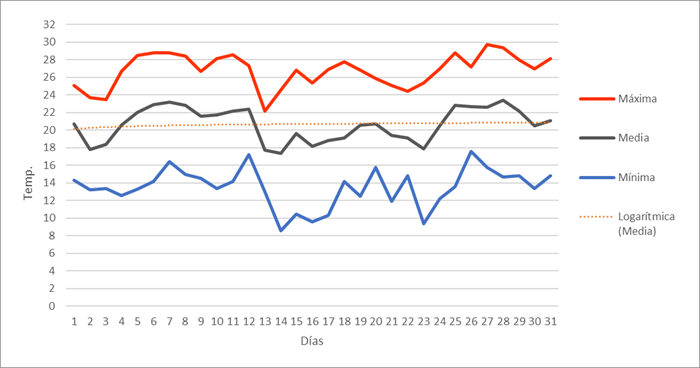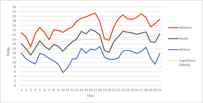 | Máxima mensual | 14,7 | 13,2 | 20,6 | 24,3 | 25,8 | 28,6 | 31,4 | 29,7 | 32,2 | 26,2 | 19,2 | 17,9 | 32,2 | Máxima mensual | |||||||||||
